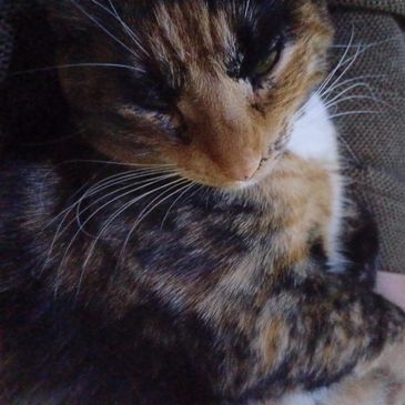 Taking after Tia, Tangie isn't always up for being held but loves to perch on your shoulders or just lay in your lap. She, like Cali, loves her outdoor time, exploring the big world outside her home.