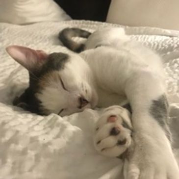 Tia joined the fray about a year after Cali, in July of 2021. A successful surprise this time, her name was chosen when Karina started saying some options out loud, and the little kitty rolled over and started purring when hearing the name, "Tia Dalma". We call her Tia for short, and boy was she living up to the name before she was snipped!